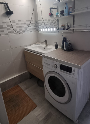 Das Badezimmer mit Dusche und Waschmaschine mit Trockner.