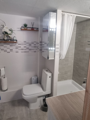 Im Obergeschoss/Mezzanine ist ein weiteres Schlafzimmer mit 160×200 cm Bett, verschiedenen Schränken und TV.