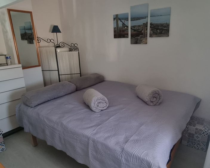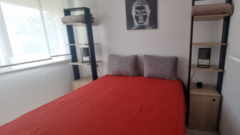 Das Schlafzimmer mit einem 160×200 cm großen Bett ist zusätzlich mit einer Kommode, Nachttischen mit Ablageflächen und TV ausgestattet.